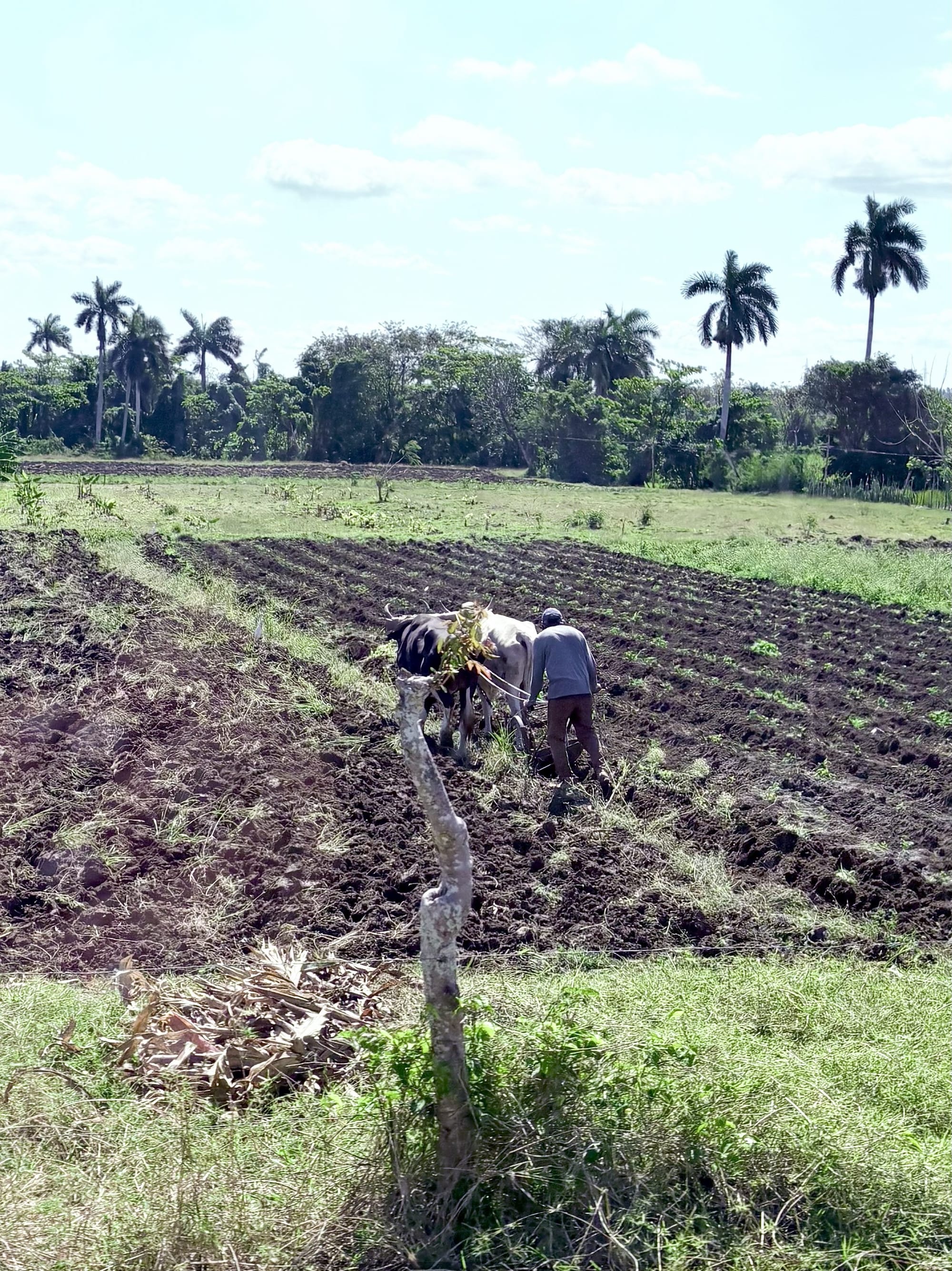 A classic American, pre-revolution-era car lives on, a farmer plows his field behind a pair of oxen, a bright yellow and blue casa in Havana, Cuba. © Laura Pevehouse