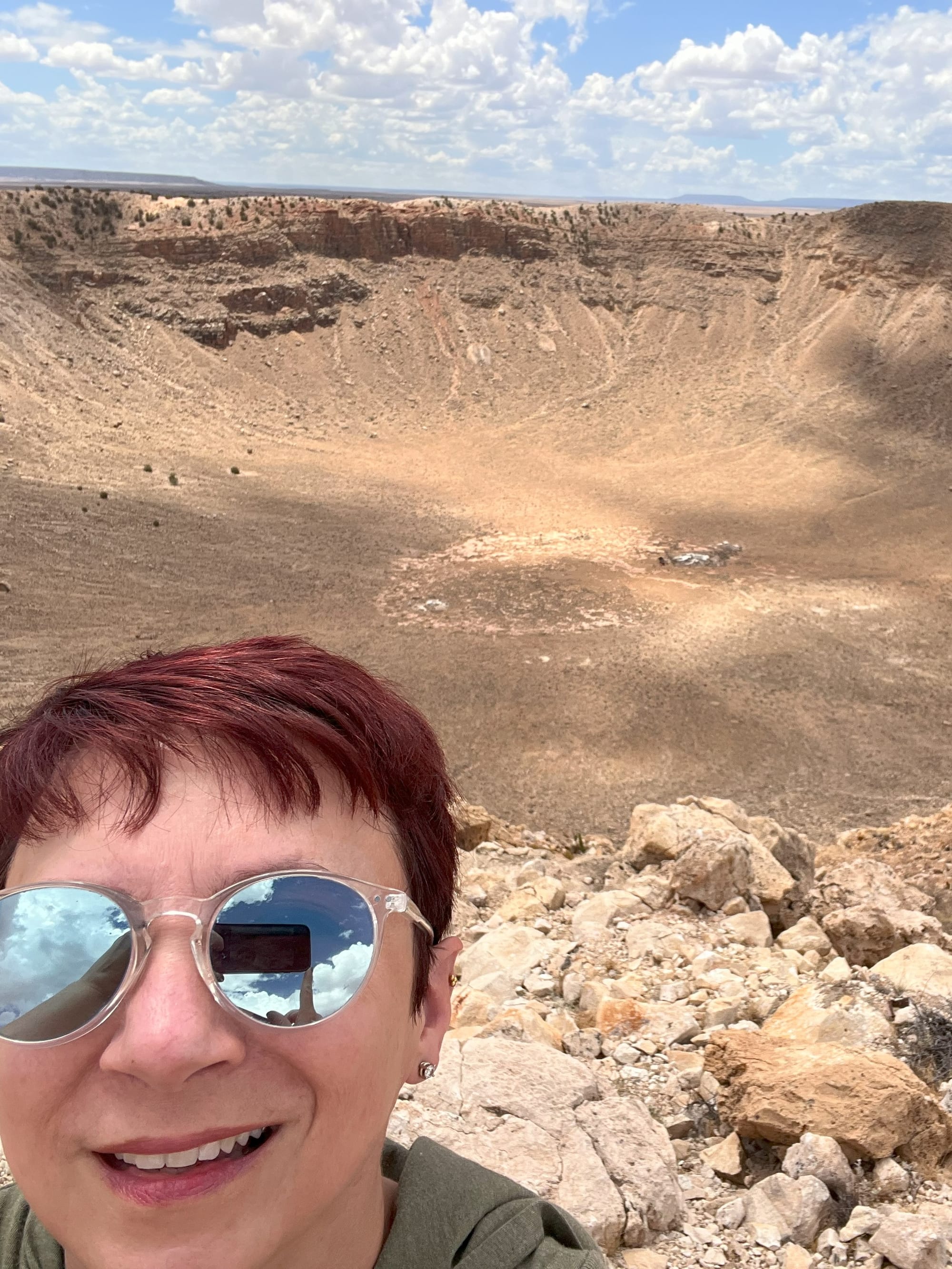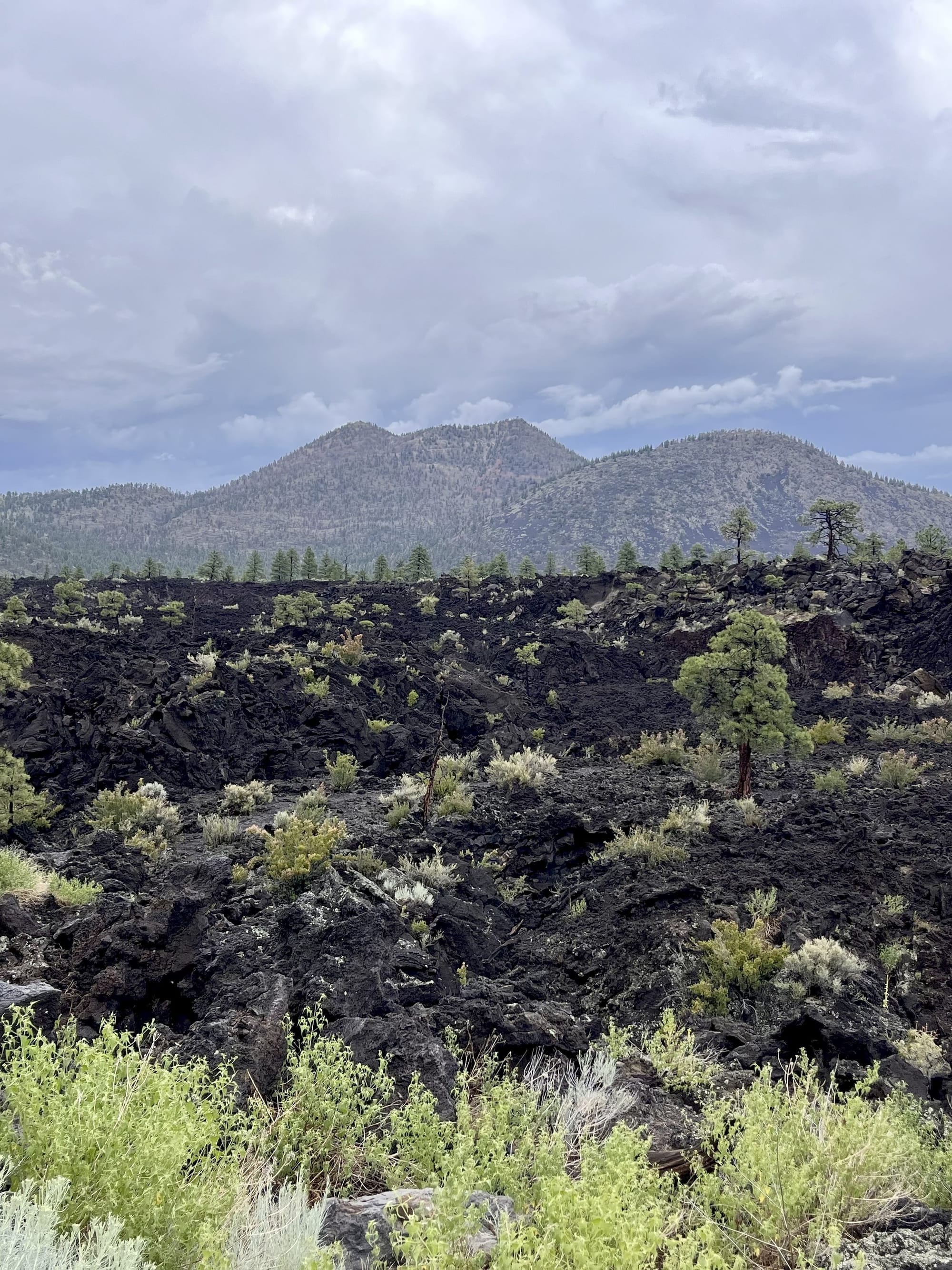 Two are such near neighbors to each other that I was able to see them both one evening after work. First, I went to Sunset Crater Volcano National Monument, which was not what I had expected. The crater was created around 1085 CE by a “curtain of fire” eruption similar to those that made the Hawaiian islands. You can understand why the astronauts who walked on the Moon trained here when you walk the jagged, black basalt rock of the Lava Flow trail. Backcountry hiking is not allowed in order to protect the park’s fragile geological features, as well as the landscape recovering from a major wildfire in 2022.