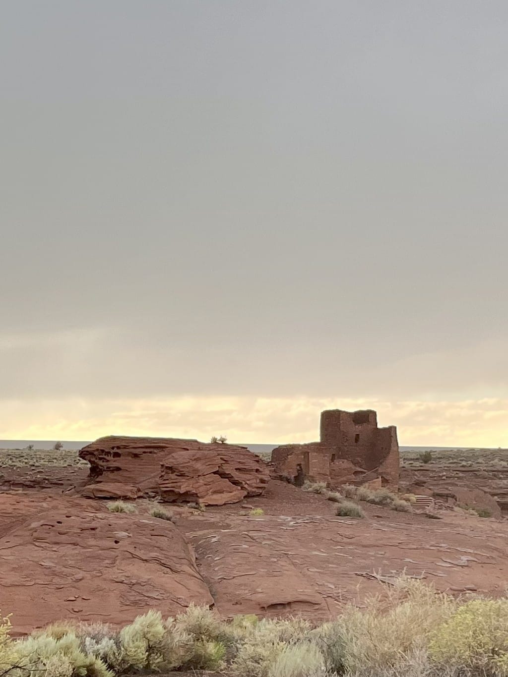 As I was returning to my car, clouds began to roll in, and on the short backroad drive over to Wupatki National Monument, I caught an amazing display of lightning across the desert. Unfortunately, it was a bit too close by the time I got to the Wukoki Pueblo, so I couldn’t safely walk around. I drove on toward the main entrance and stopped at the Citadel and Nalakihyu Pueblos, where I waited out the storm while eating the sandwich I’d packed. One other car was parked nearby, so I kept my doors locked and one eye on the stranger. But eventually the rain let up, and a double rainbow drew us both out. That’s when I met a very nice fellow solo traveler named Viola from Virginia who’d also been keeping a wary eye on me. Together we kept watch for more lightning while walking up to the Pueblo’s high point for some fantastic panoramic views and a post-thunderstorm sunset.