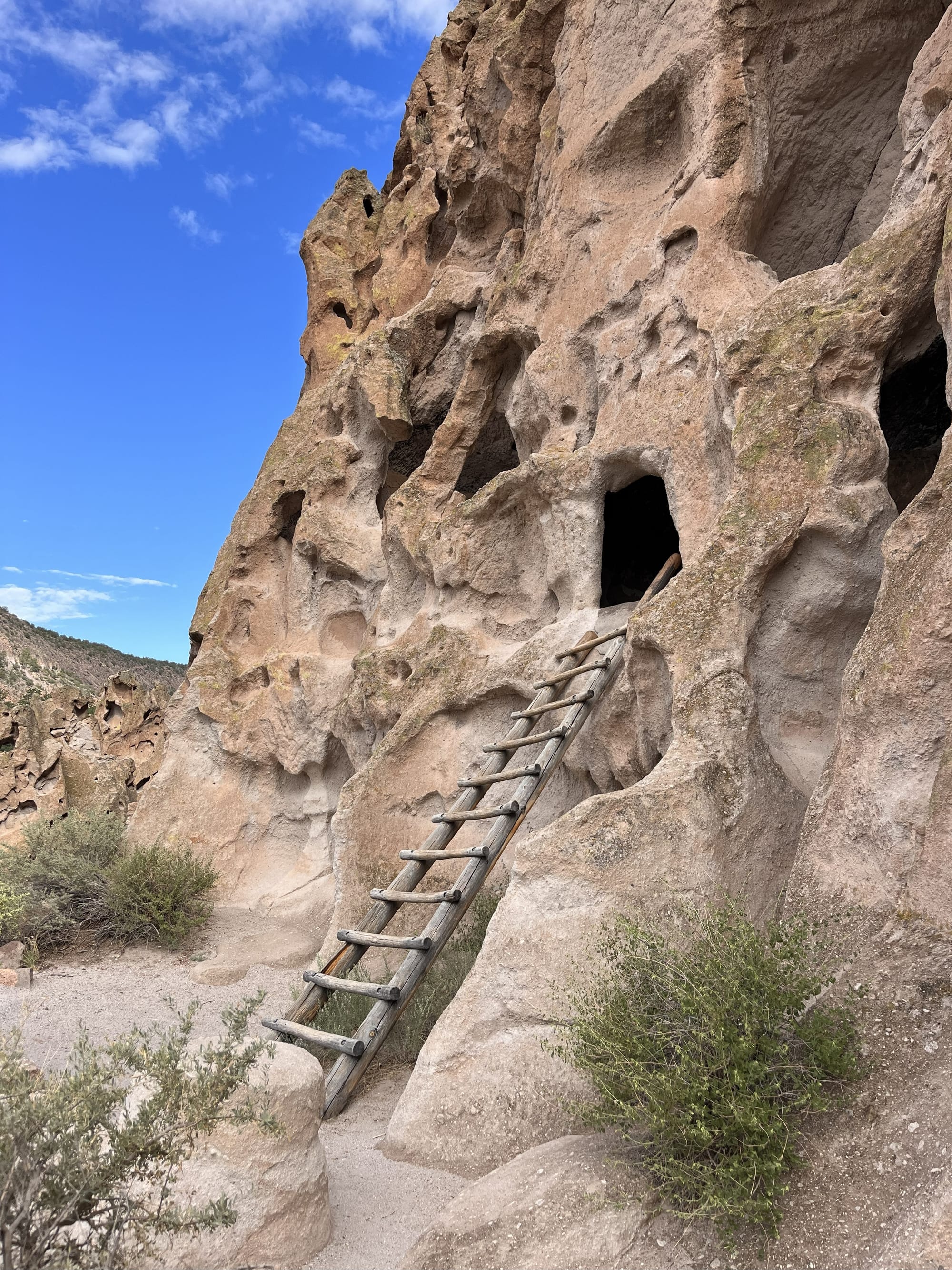 Many, many years, like 11,000 or so, before the physicists came to this part of northwest New Mexico, Ancestral Pueblo people began to carve homes in the dramatic cliffs of Frijoles Canyon. Using hand tools, they enlarged openings in the porous volcanic tuff (rock formed from ash) to create cavates and used blocks of it to build apartment-like homes in front of them.